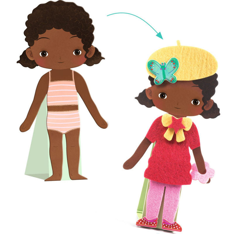L'enfant s'amuse à habiller 12 personnages (6 filles et 6 garçons) avec de la feutrine autocollante toute douce.