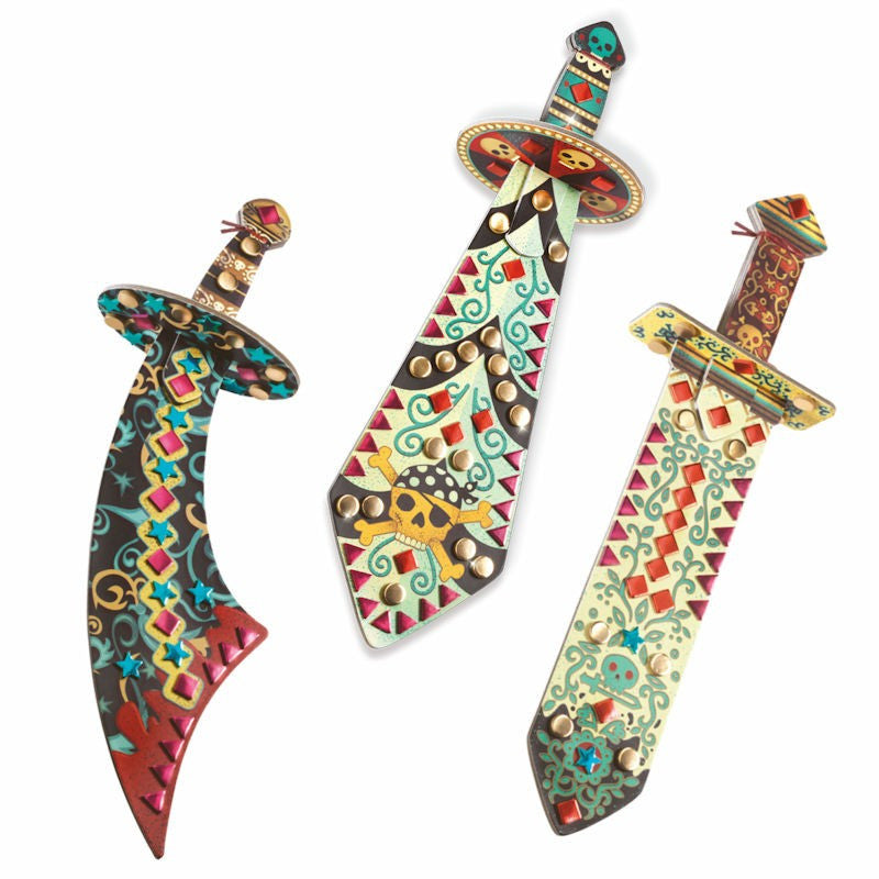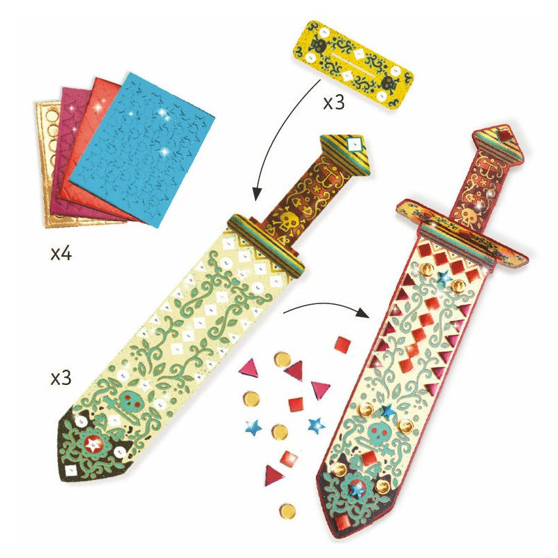 3 sabres et épées de pirates à décorer grâce aux mosaïques autocollantes fournies...