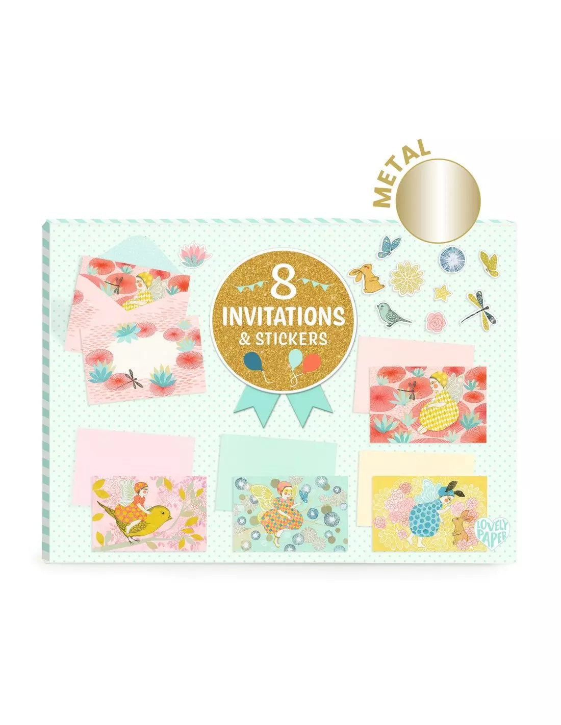 Découvrez les cartes d'invitation Fées d'un jour de Lovely paper by Djeco, un coffret de papeterie aux effets métallisés renfermant des cartes d'invitation illustrées, des enveloppes assorties et des planches de stickers pour personnaliser chaque message.