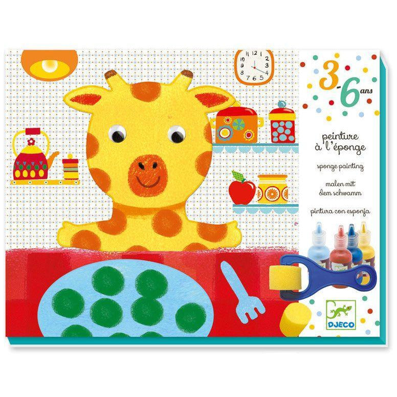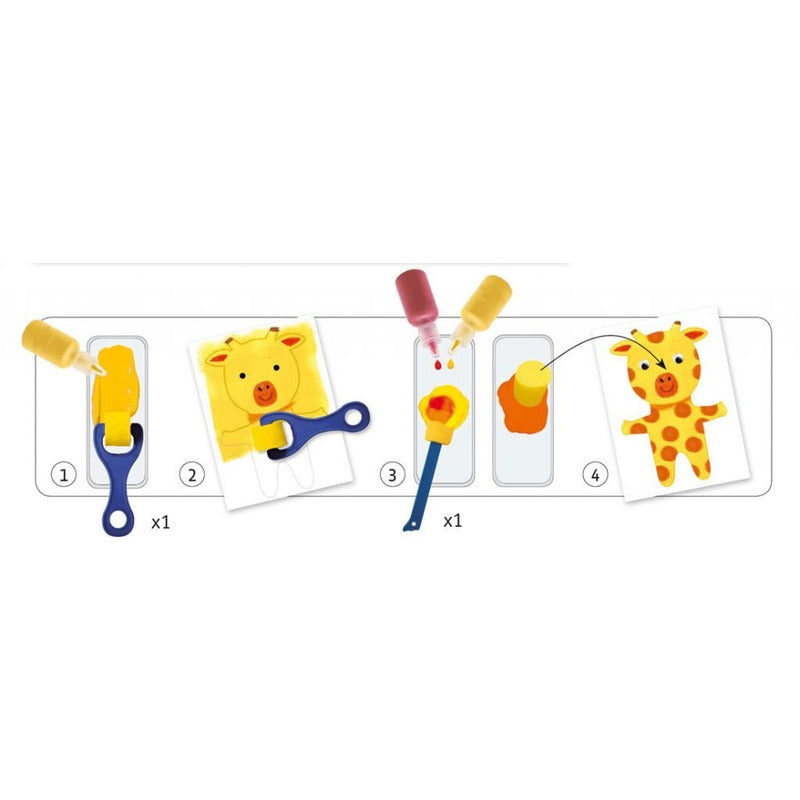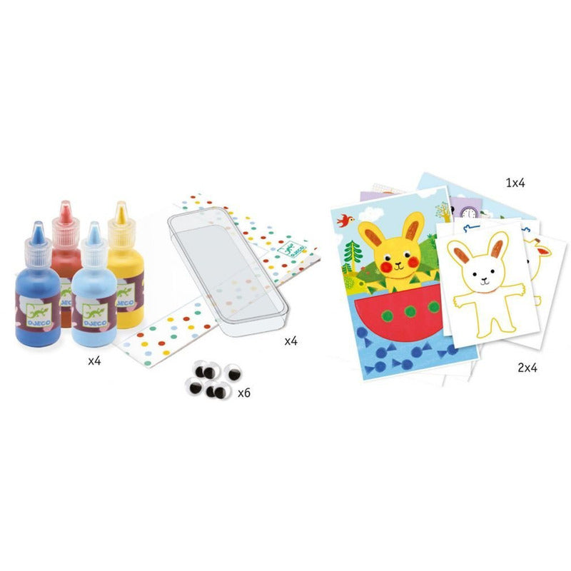 Boite 29.5 x29 4 cm, 4 affiches à compléter, 8 planches avec des formes à détacher, 4 bouteilles de gouache 30 ml, 2 rouleaux, 1 pinceau, 4 éponges, 6 yeux mobiles, une nappe, 1 barquette, 1 livret pas à pas.