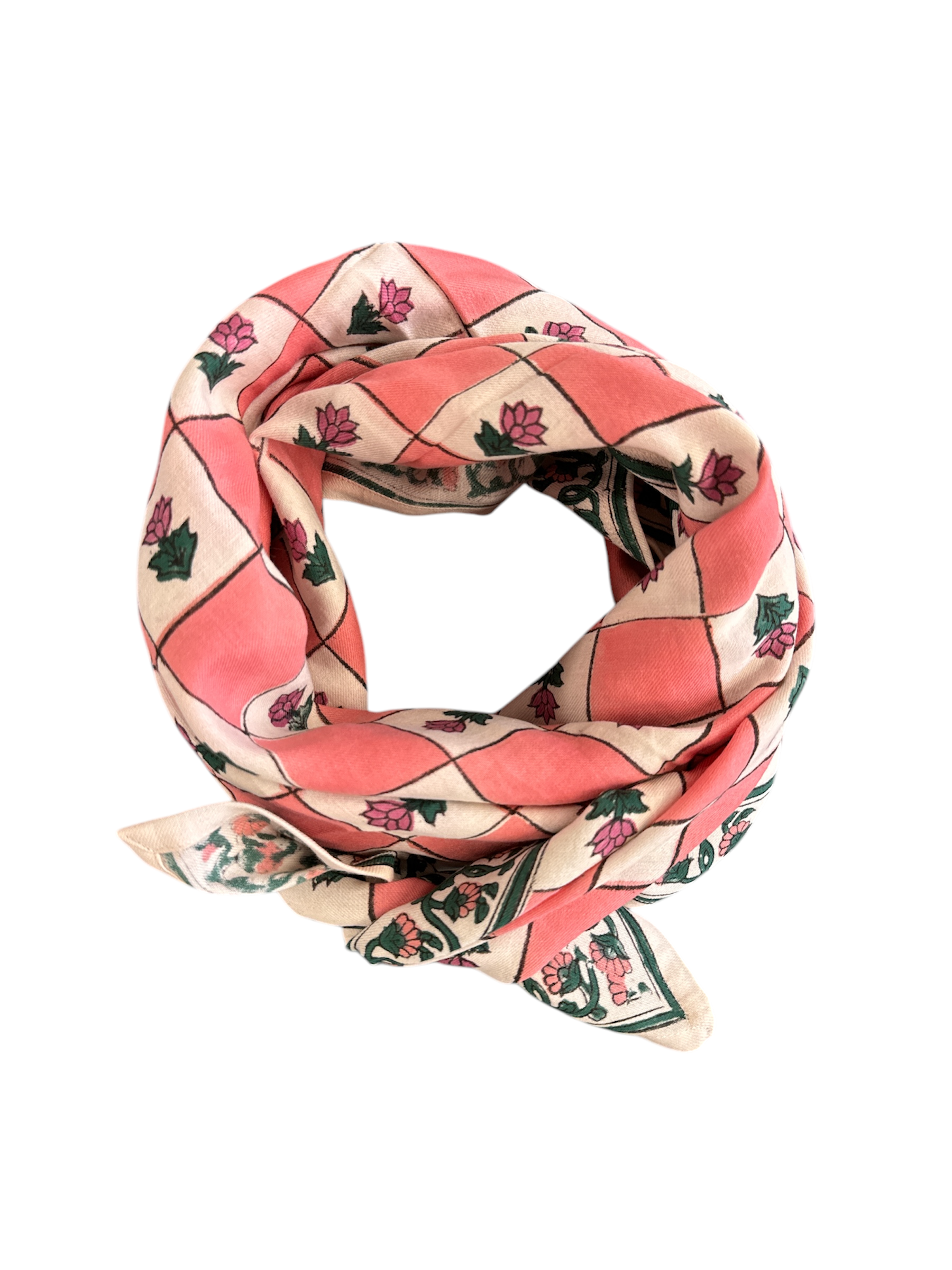 Un beau foulard  confectionné artisanalement grâce à la technique indienne du block-print.