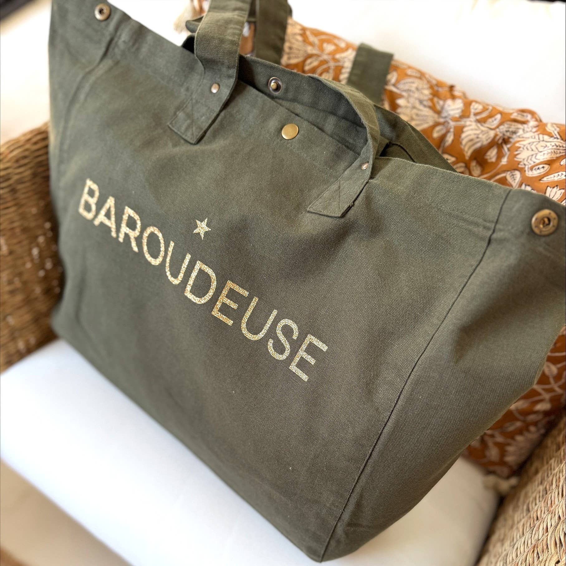 Grand sac cabas 100 % coton Oekotex délavé pour un look hyper stylé et décontracté, coloris vert forêt avec son imprimé pailleté or "Baroudeuse" Poche intérieur avec fermeture éclair pour y glisser vos clefs, porte monnaie, paire de lunettes... Fermeture du sac par bouton pression.
