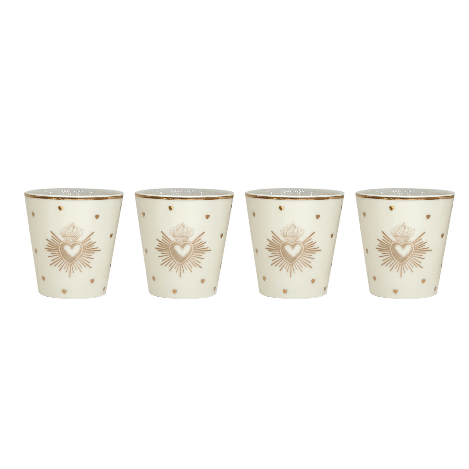 Le Set de 4 Verres en Faïence Fine "Ex-Voto" allie élégance et raffinement avec ses motifs cœur délicatement sérigraphiés en blanc et doré ou blanc et noir.