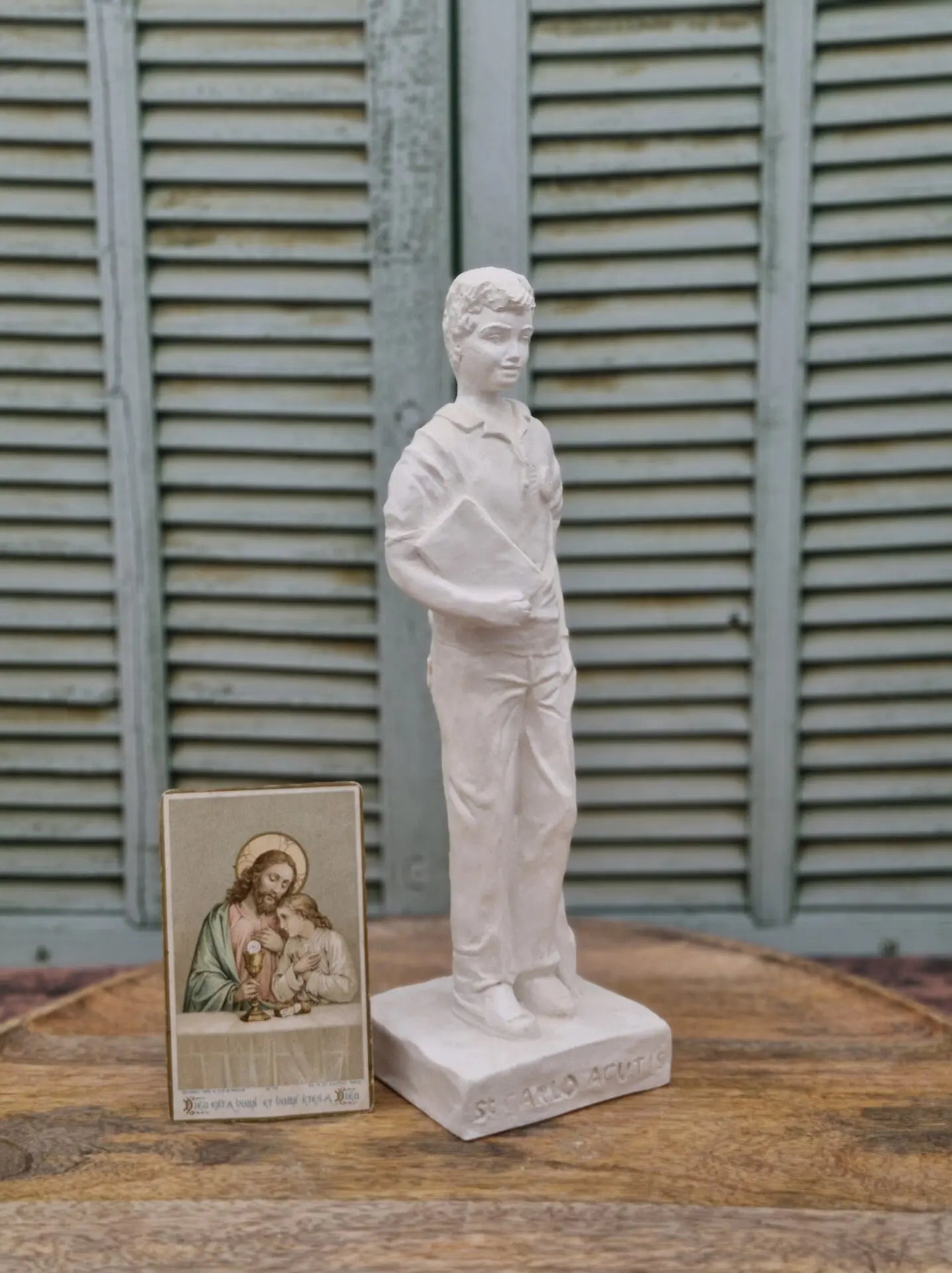 Cette statue représente Saint Carlo Acutis, jeune témoin de foi et de modernité, tenant la bible avec à ses pieds un cartable, symboles de son amour pour l'étude, l'Eucharistie et la vie quotidienne vécue dans la foi.