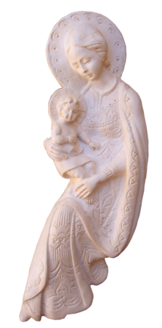 Cette œuvre pleine de tendresse représente la Vierge Latina portant l'Enfants Jésus  dans ses bras. Son visage empreint de douceur et de sérénité reflète l'amour maternel et la grâce. Réalisé en plâtre statuaire de haute qualité, cette pièce murale est soigneusement patinée à la main dans des tons ivoire doux à l’aide de cires et de pigments naturels, lui conférant un aspect à la fois raffiné et authentique.