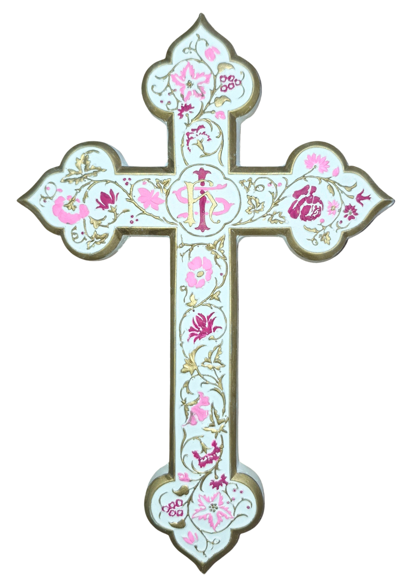 Cette croix élégante associe la pureté du plate statuaire à la richesse de délicats ornements rose, violet et doré. Chaque détail est travaillé à la main, mettant en valeur la finesse et la profondeur des symboles chrétiens.