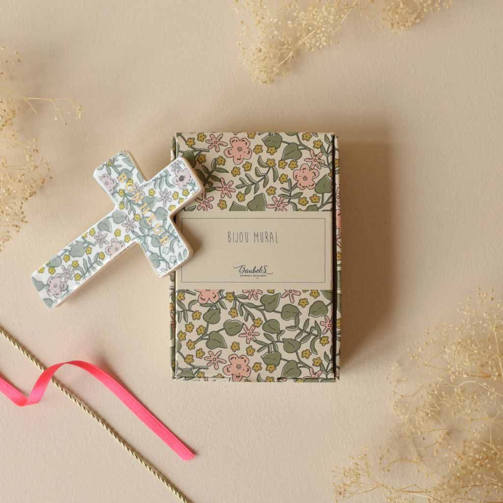Cette croix murale au joli motif fleuri est le cadeau idéal pour les occasions importantes : une Naissance, un Baptême, une Communion, un Mariage, une pendaison de crémaillère...et aussi juste l'envie de faire plaisir! A suspendre ou à poser, elle trouvera facilement sa place pour une déco poétique.