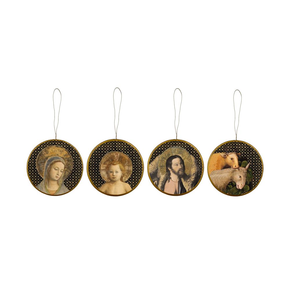 Set de 4 médaillons , reprenant les personnages traditionnels de la crèche, l’enfant Jésus, Joseph, Marie, l’âne et le bœuf. Les médaillons sont illustrés recto/verso et la bordure est dorée. Suspendus sur le sapin, ces médaillons apporteront une touche remarquable à votre décoration de Noël.