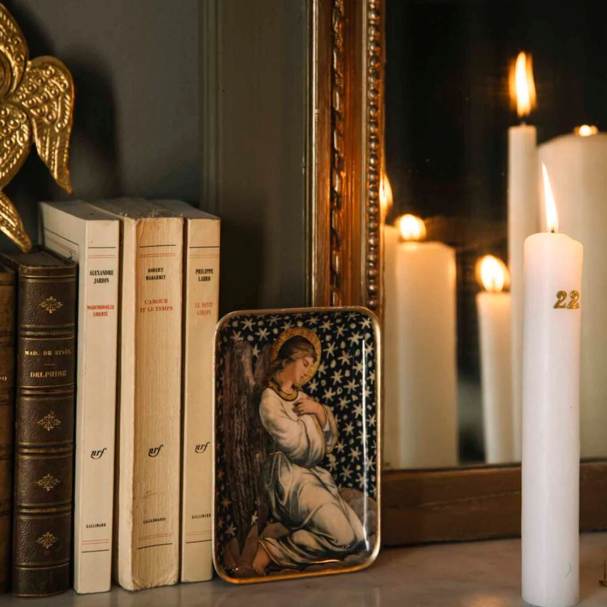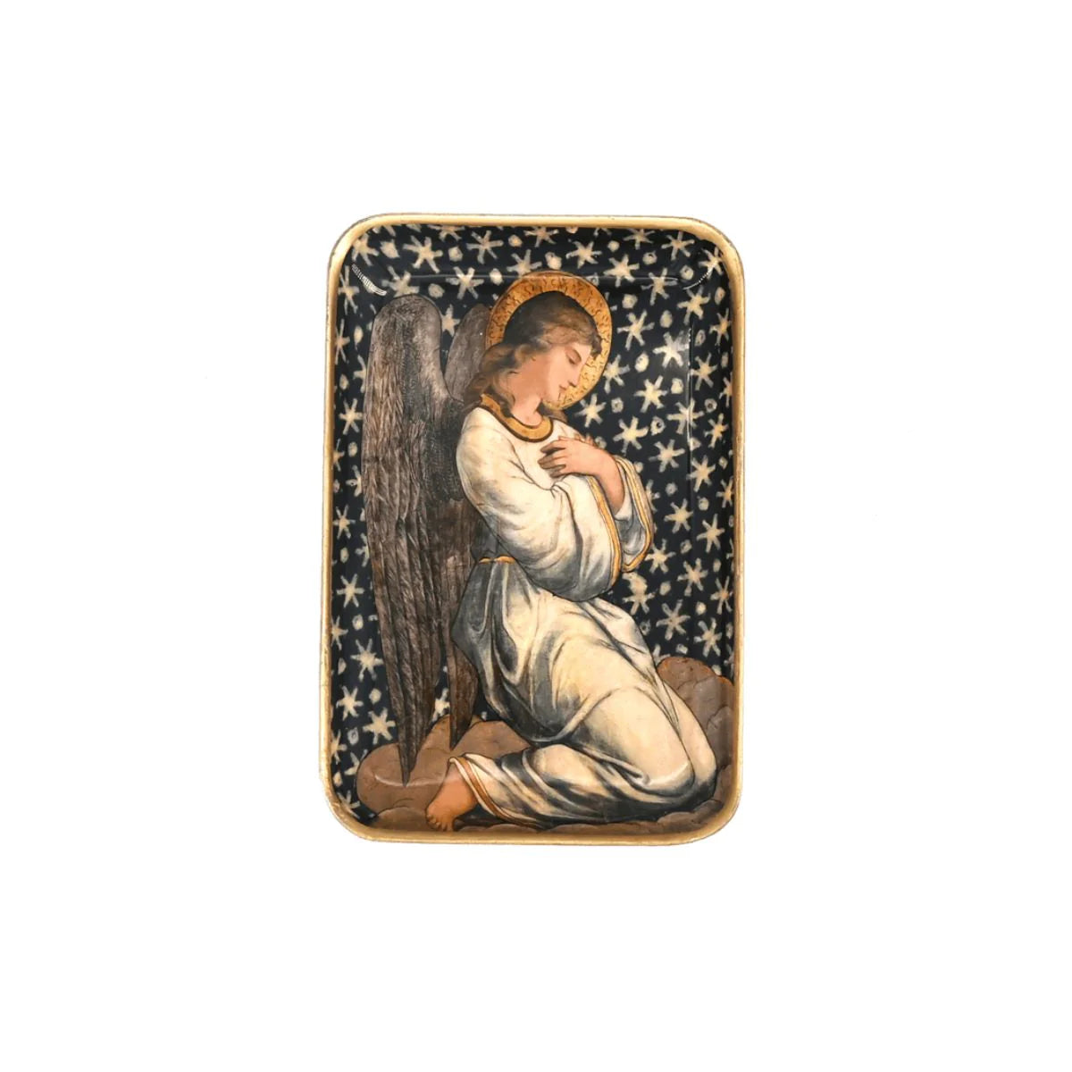 Sur un fond étoilé d’une grande finesse, un ange recueilli se détache, symbole de paix et de lumière.