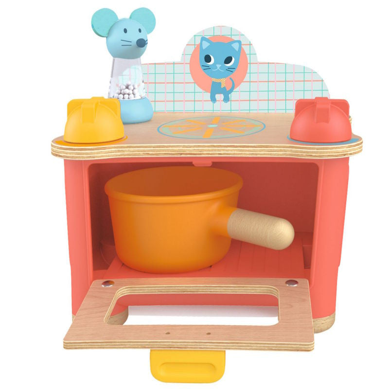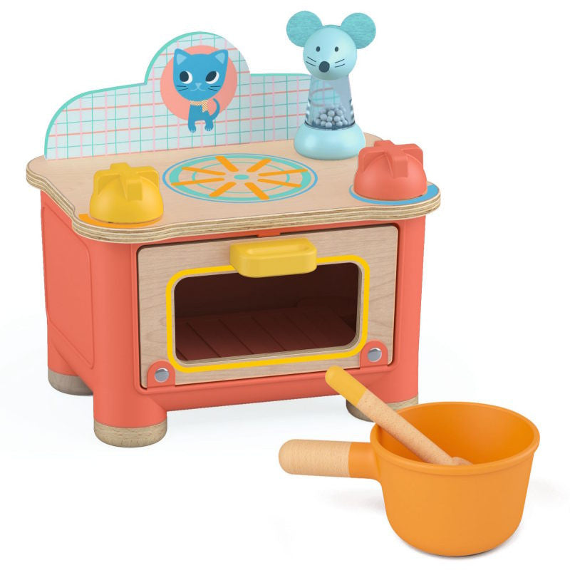 Une jolie cuisinière compacte, équipée d'un four et d'une plaque de cuisson: l'enfant peut cuisiner de bons petits plats à l'aide de la casserole et de la grande cuillère en bois. Ne pas oublier d'assaisonner son plat avant de le servir avec la salière souris ! Un premier jeu d'imitation pour les enfants à partir de 18 mois...