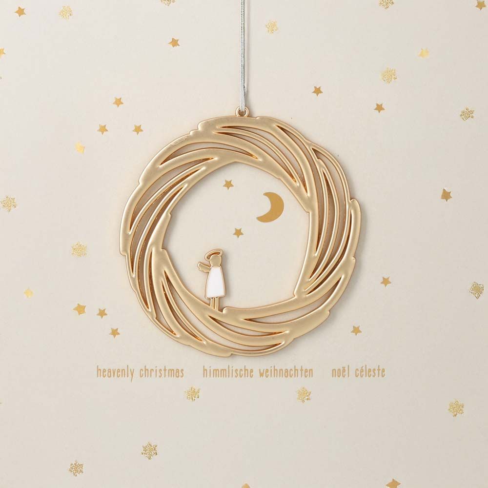 Un joli petit ange, entouré d’une couronne dorée aux lignes douces, évoque la tendresse des fêtes traditionnelles Accrochés à un ruban fin, cet ornement trouve sa place sur un sapin, une poignée de meuble ou encore en décoration murale.