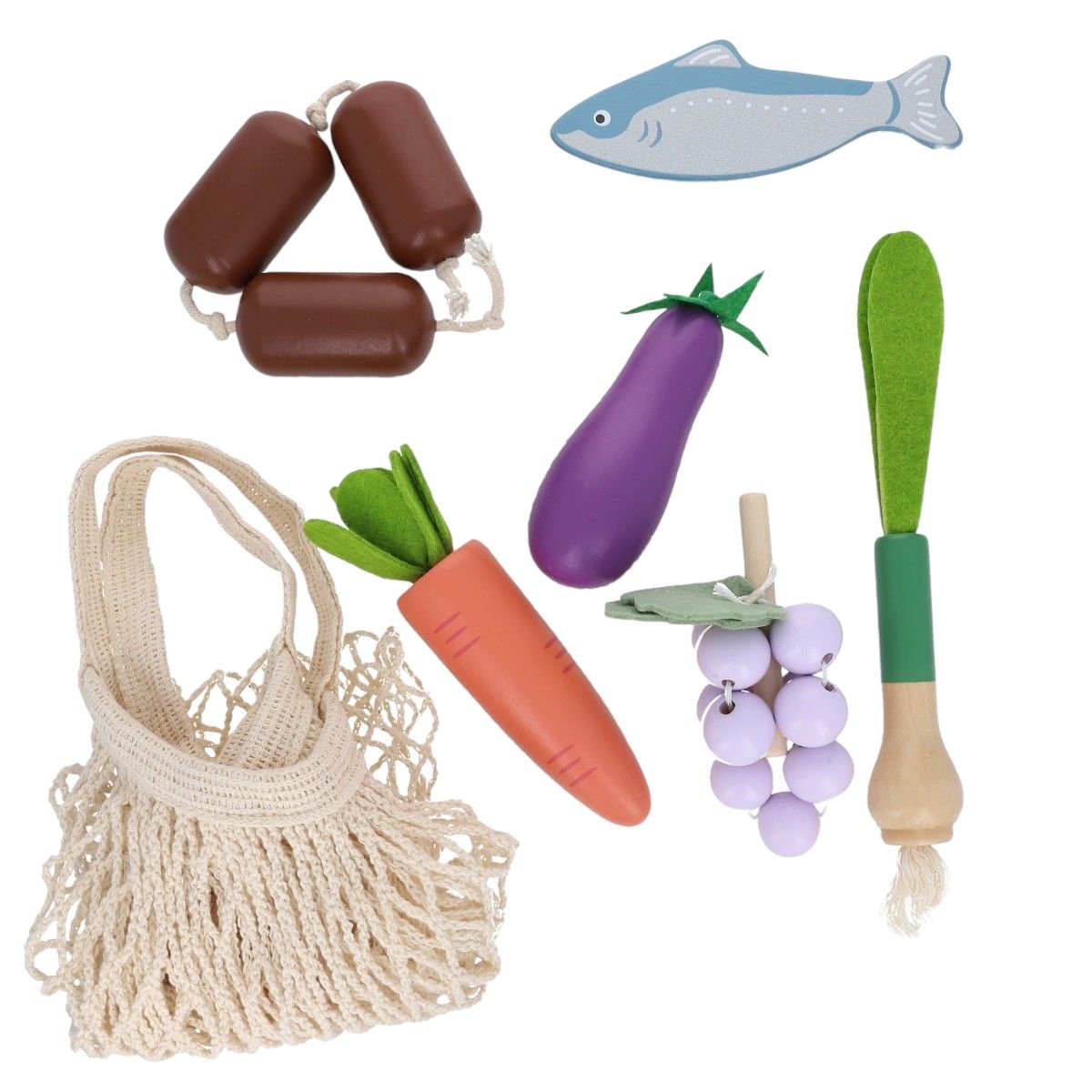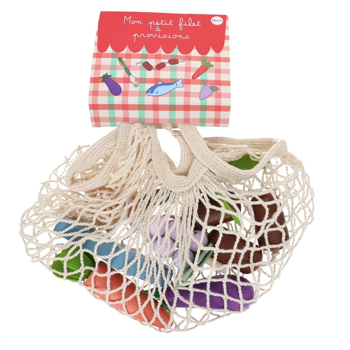 Voici le joli filet rempli de fruits et légumes pour des heures de jeu créatif. Votre bout de chou va adorer jouer à la cuisine et au marchand et préparer de bons petits plats équilibrés. Aubergine, carotte, raisins, poisson, saucisse… Tout y est pour faire le plein de vitamines et stimuler la créativité.
