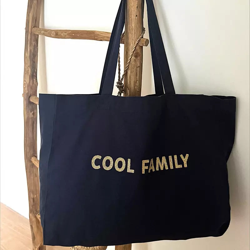 Grand sac cabas 100 % coton Oekotex délavé pour un look hyper stylé et décontracté, coloris bleu marine avec son imprimé pailleté or "Cool Family".