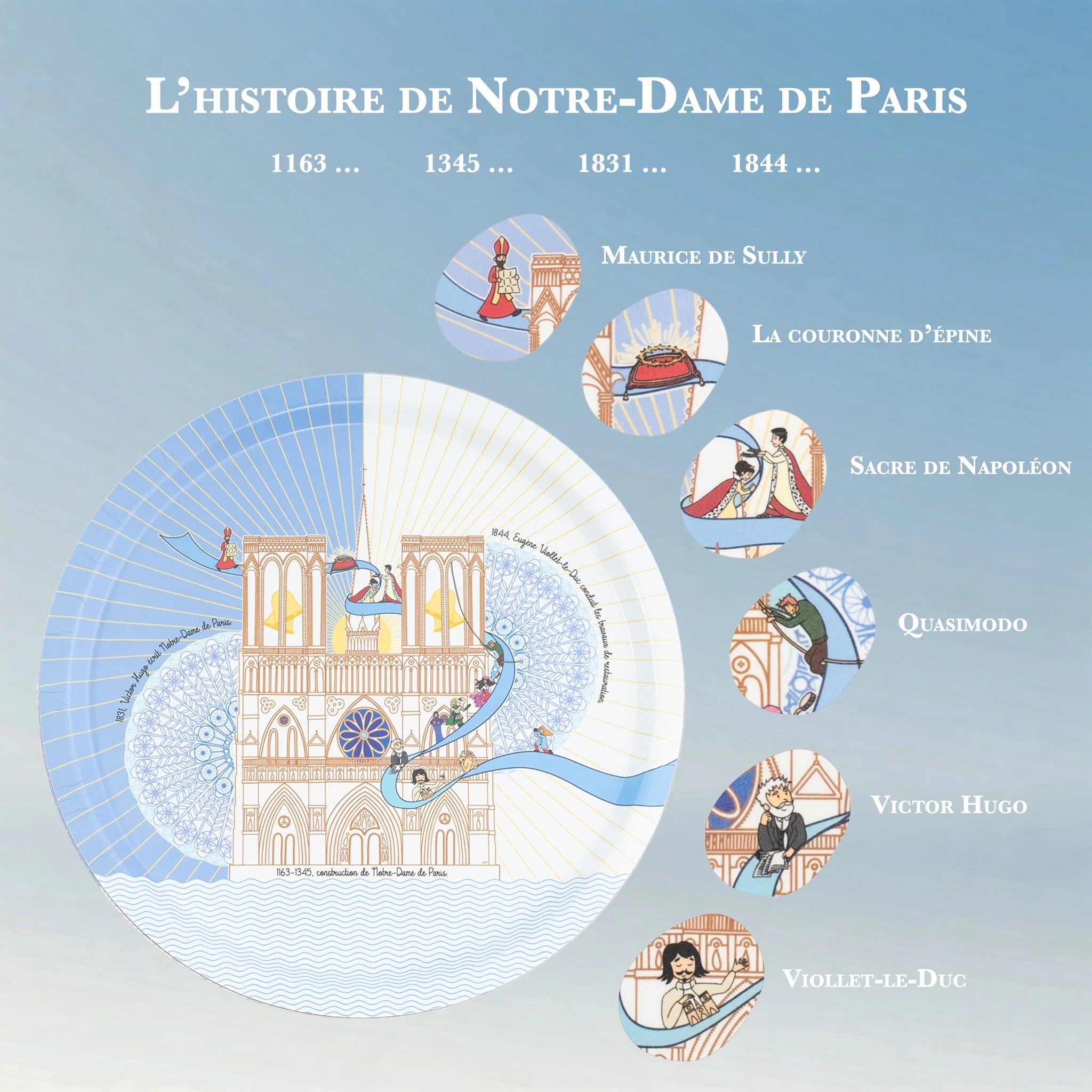 Observez et découvrez les dates clés et les personnages emblématiques de l'histoire de Notre-Dame. Vos invités, intrigués par la beauté de ce plateau, ne manqueront pas de s'émerveiller de l'histoire qu'il raconte.