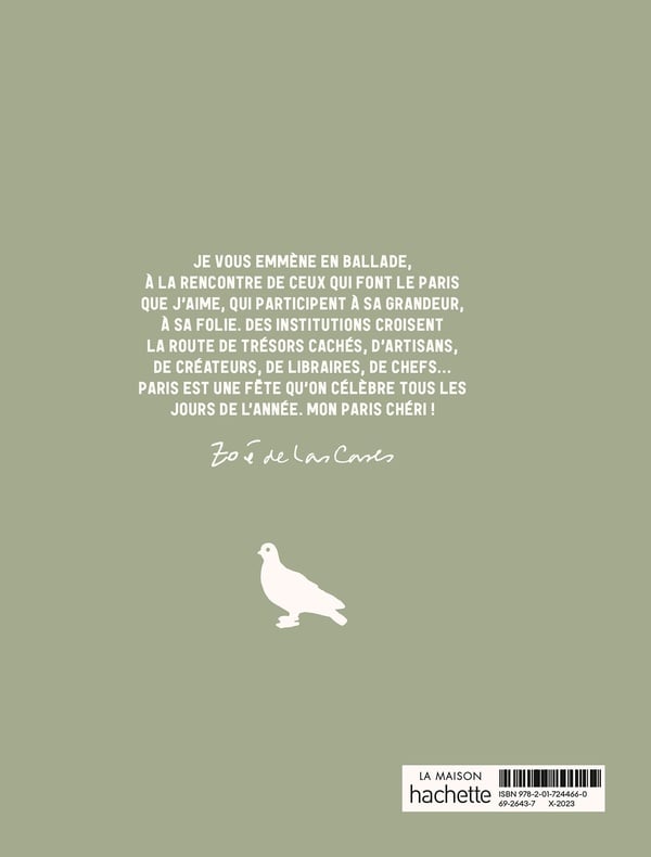 "Je vous emmène en ballade, à la rencontre de ceux qui font le Paris que j'aime, qui participent à sa grandeur, à sa folie. Des institutions croisent la route de trésors cachés, d'artisans, de créateurs, de libraires, de chefs... Paris est une fête qu'on célèbre tous les jours de l'année. Mon Paris chéri !" Zoé de las Cases