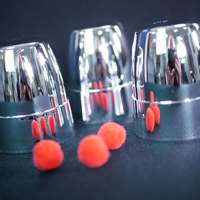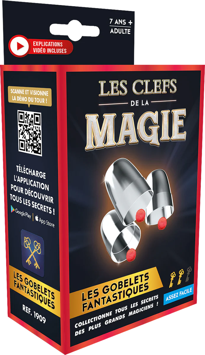 A l'aide des Gobelets Fantastiques, tu présentes 3 gobelets argentés et 3 petites balles. Place une des balles sur un gobelet et empile les 2 autres par-dessus. Réalise une passe magique... Incroyable ! La balle passe au travers du gobelet.
