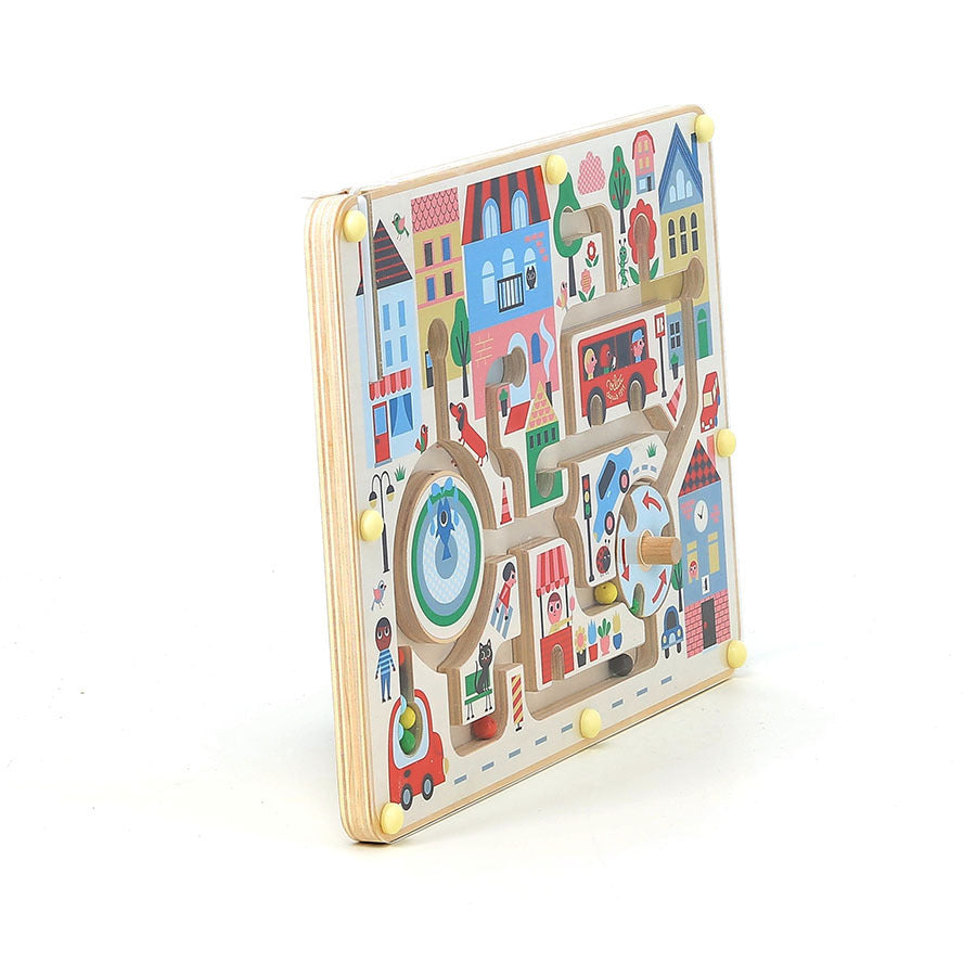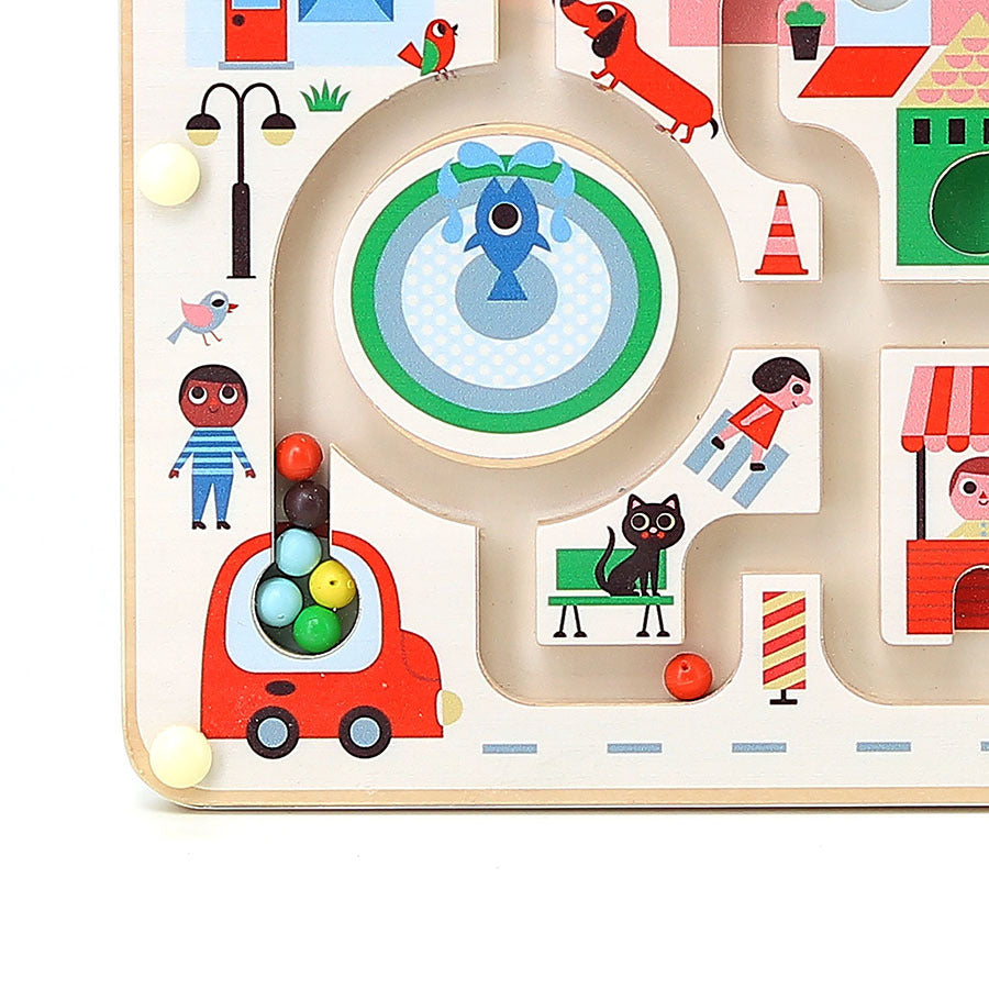Bienvenue dans Ma petite ville, labyrinthe magnétique dessiné par l’artiste Ingela P.Arrhenius. Grâce à un petit stylet magnétique, votre enfant fait voyager les billes de couleur d’une rue à l’autre : une bille verte dans un arbre, une rouge dans la fleur, deux autres dans les roues du bus. C'est encore plus rigolo en passant par le rond-point qu'il faut actionner !