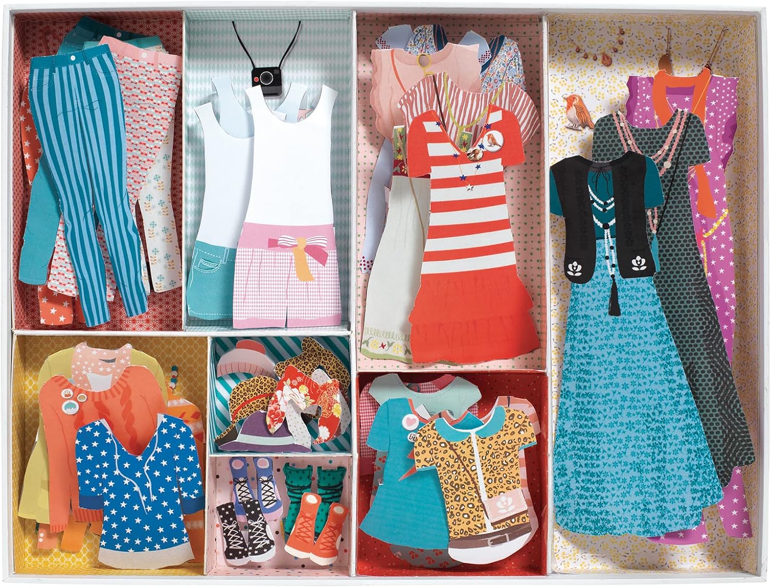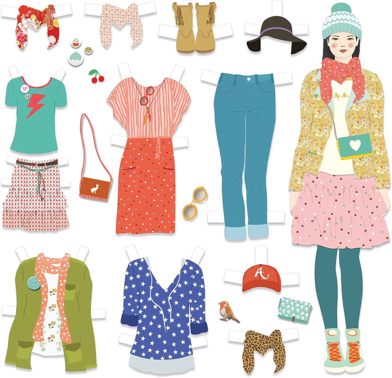 • Contenu de la boîte : - 3 jeunes filles en carton épais - 110 vêtements (robes, jupes, pantalons, chemises, vestes, sacs à main, chapeaux, chaussures ...)